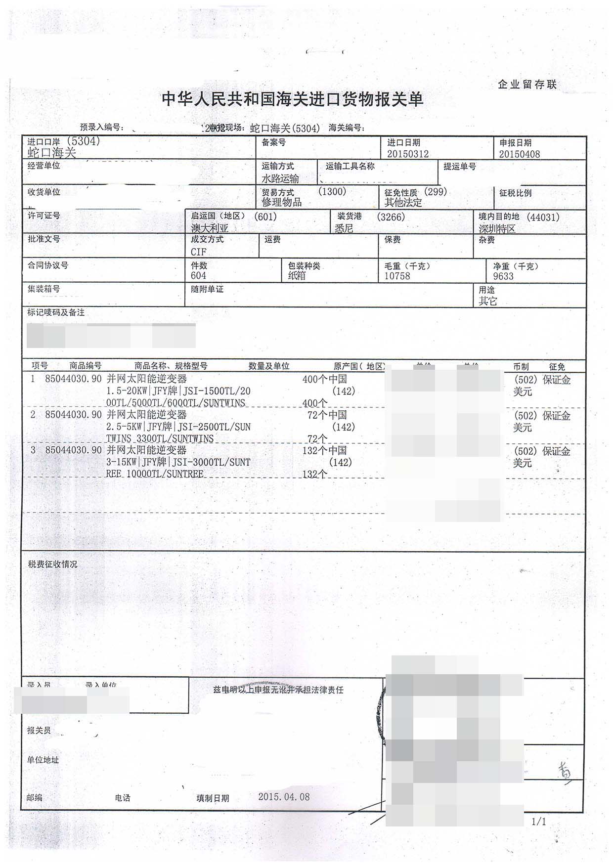 【文章標題】:并網太陽能逆變器進口報關案例 http://m.bwcailiao.cn/lm5/52.html 轉載請注明出處